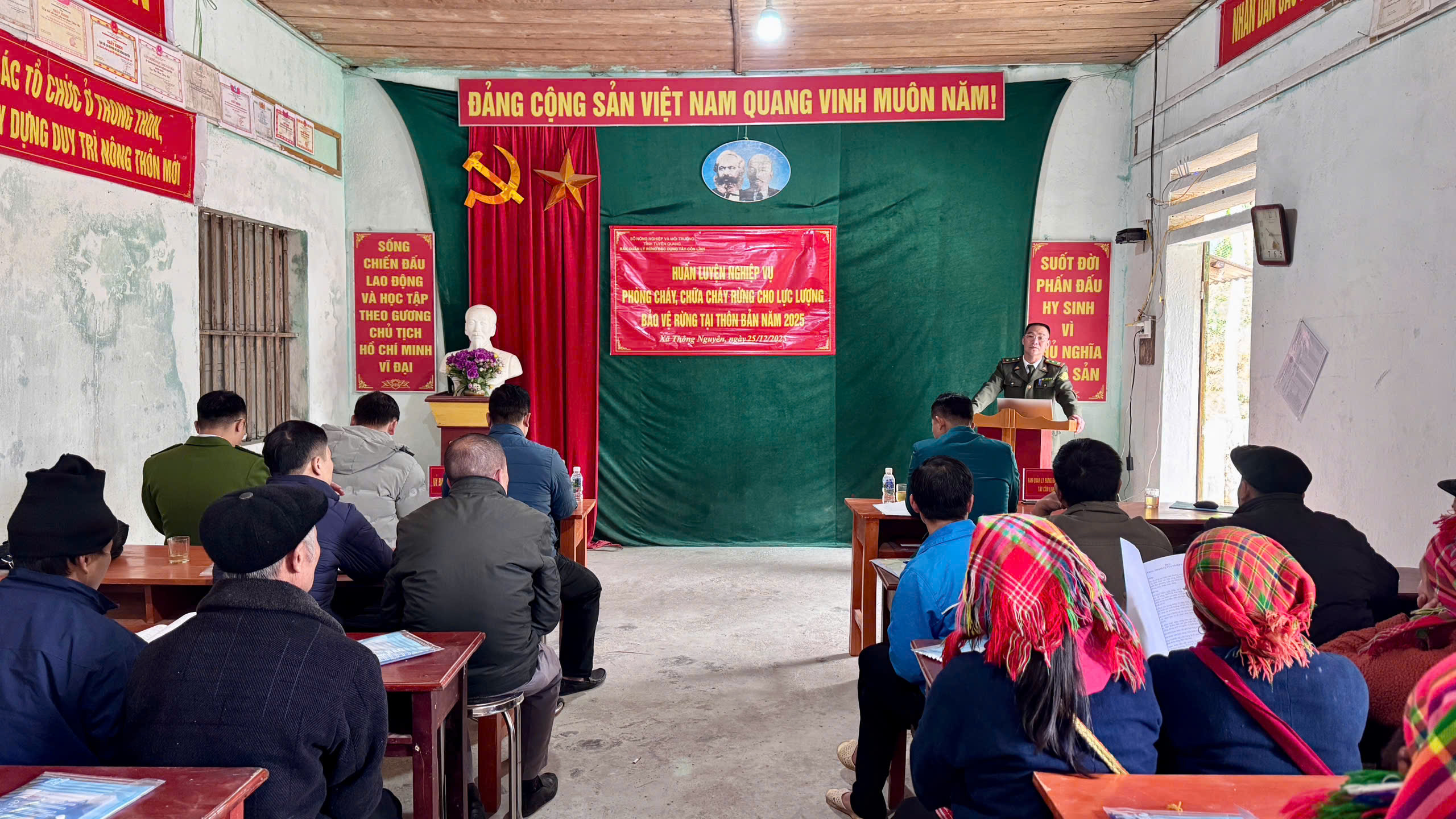 Trong đó, ở phần thực hành, các học viên đã tham gia thực hành phòng cháy, chữa cháy rừng thông qua tình huống giả định: đám cháy nhỏ xảy ra tại khu vực rừng xa khu dân cư, địa hình phức tạp, không có sóng điện thoại. Lực lượng tham gia được tổ chức, phân công cụ thể; kịp thời báo cáo cấp có thẩm quyền, huy động lực lượng tại chỗ và sử dụng các dụng cụ thủ công như dao, cuốc, cành cây tươi để khống chế, dập tắt đám cháy, không để cháy lan rộng. Sau thời gian khoảng 1 giờ, đám cháy được khống chế và dập tắt hoàn toàn; các lực lượng tiến hành tổng hợp báo cáo, xác định diện tích thiệt hại và triển khai các biện pháp khắc phục hậu quả theo quy định.